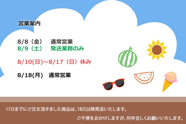 8/8(金) 通常営業 8/9(土)発送業務のみ 8/10(日)〜17日(日)休み 8/18(月)通常営業 ご不便をおかけして大変申し訳ございません。何卒宜しくお願い致します。