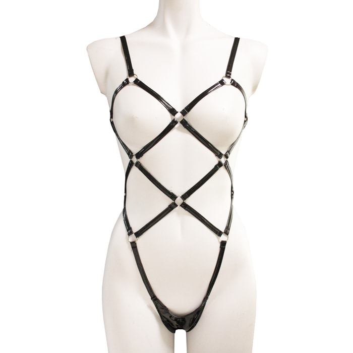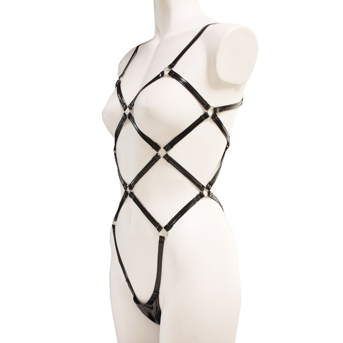 エナメル生地は、独特の光沢と艶やかな外観が魅力です。滑らかで冷たい手触りが特徴で、ポリウレタンやPVCでコーティングされた布地やレザーが使われています。高級感のある見た目が特徴のエナメル生地を使用したプレイスーツになります。亀甲縛り風プレイスーツは、独特の縛りデザインが特徴で視覚的に魅力的なシルエットを作り出します。身体にぴったりとフィットし、セクシーで挑発的な印象を与えるアイテム。縛りデザインがエッジの効いた美しさを演出し特別なシーンにぴったりの1枚です。